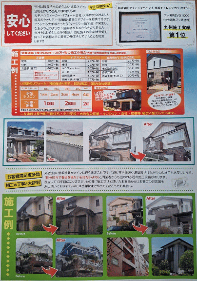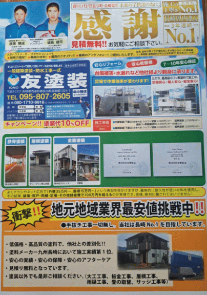「長与町内で看板を見ない日はないよね」と同業者からも言われる程の施工実績があります。独立して12年ですがその間に施工させて頂いたお客様からはお喜びのお言葉を沢山頂いております。中には感謝状まで作ってくださったお客様も。